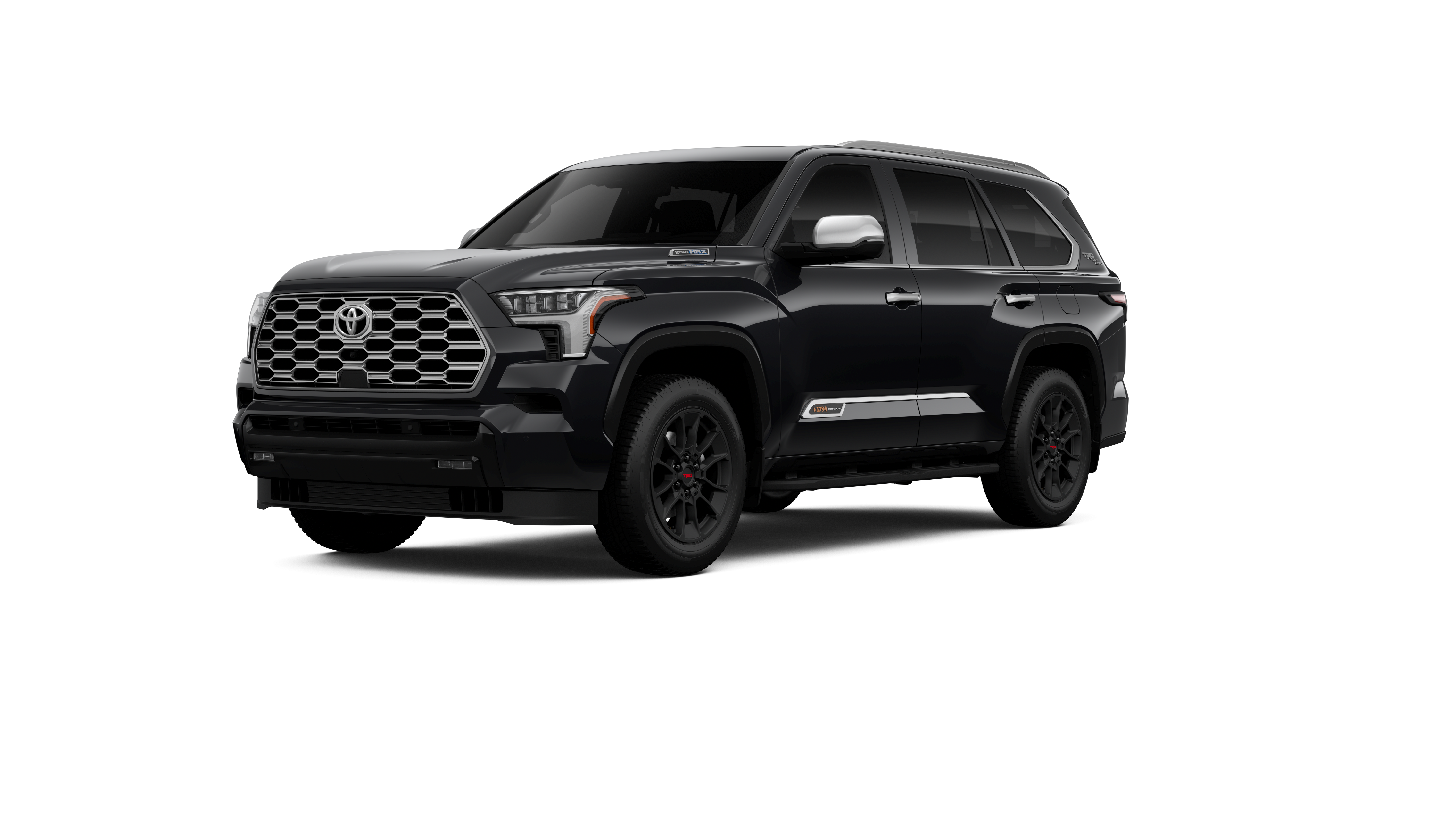 - Bright-chrome "SEQUOIA" rear door badge, chrome "1794 EDITION" door badge and garnish, door handles, window molding and mirror caps; color-keyed tailgate spoiler; black-painted overfenders