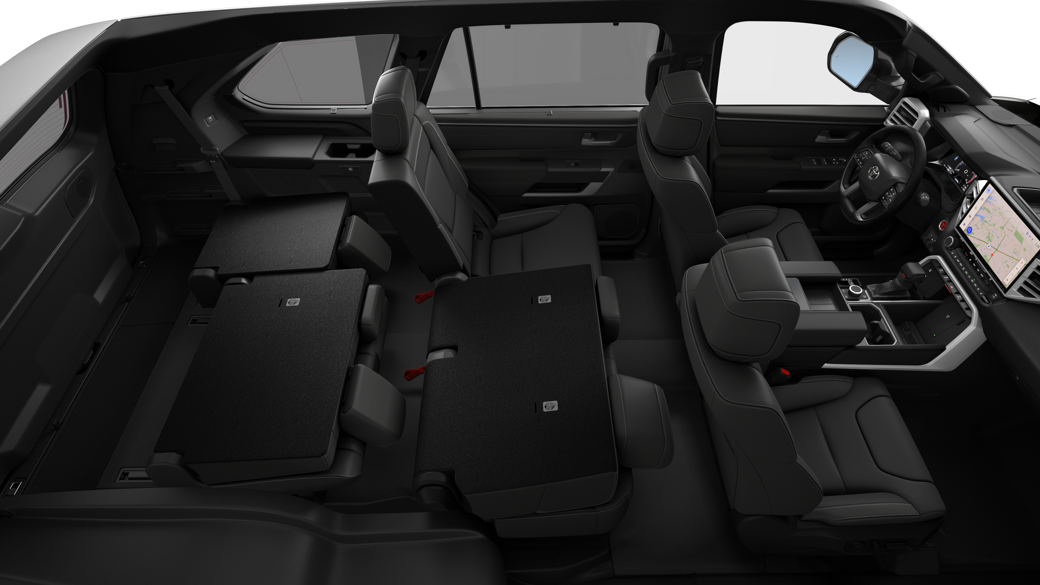 - Leather-trimmed 60/40 split, sliding, power-reclining, power fold-down third-row seats with adjustable headrests